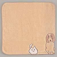 右下にかわいい犬が2匹刺繍されているタオルハンカチです。犬好きの方におすすめ。無撚糸使いでふんわり優しい肌触りです。裏面もツートンカラーになっていておしゃれな作りです。