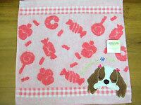 ピンクのリボンは女の子。タオル地もピンクが基調、おいしそうなキャンディが織り込まれたかわいいハンカチです。