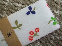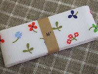アンヌ:綿の柔らかな明るい白に色とりどりのお花や葉っぱを散りばめています。女の子の小物や洋服にぴったりの小花柄。幅広テープなので、クロスや小物の縁取りにも使えます。