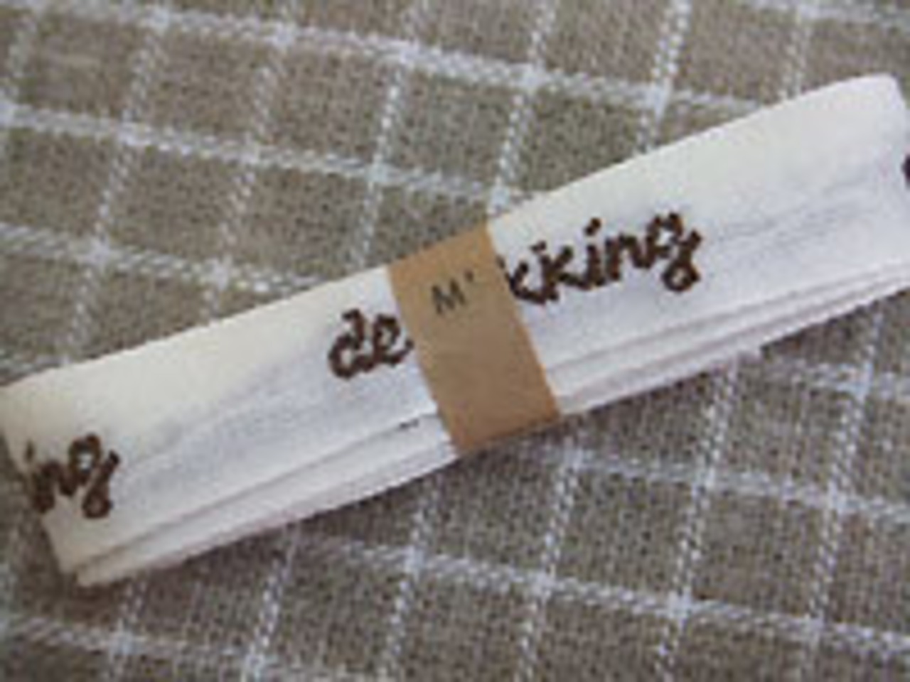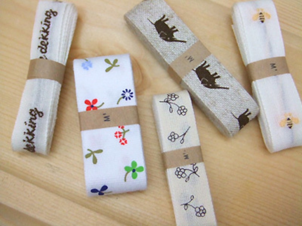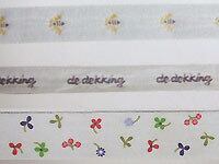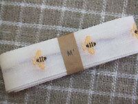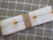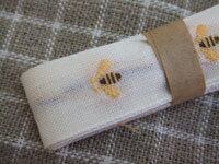 はち&deckking:織でちいさなハチとオランダ語decking(=食器)と入れたコットンテープです。コットンの柔らかな素材感は、麻生地にもよくなじみます。クロスに縫い付けて、アクセントラインとして使うのも素敵。