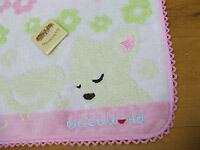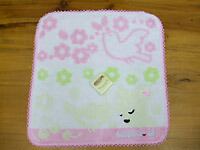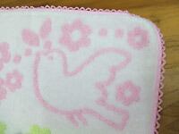 イヌとトリ:写真では見えにくいですが、下にオフホワイトのワンコとコトリ、上にはピンクのコトリがタオル地で描かれています。縁もかわいいピンク編み。
