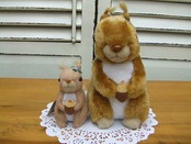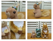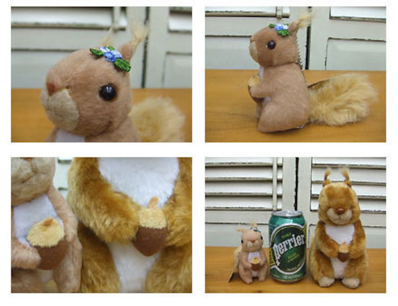 かわいい!思わず抱きしめたくなる、小花をつけたおしゃれなリスさん。つぶらな瞳、ふわふわのシッポと耳の毛がキュートですよ。どんぐりをしっかりとかかえています。リスポーチSは写真左側です。(リスポーチLは別ページです。)
